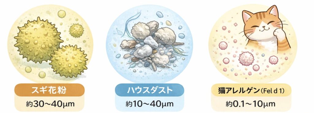 猫アレルゲンの正体である「Fel d 1」は、スギ花粉と比較しても圧倒的に小さな微粒子です。その大きさは直径約0.1〜10マイクロメートルとされ、スギ花粉の約30〜40マイクロメートルと比較して10分の1以下の極小サイズとなります。